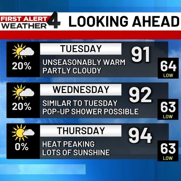 Tuesday: Starts seasonable, then turns hot. Isolated afternoon showers possible. High: 91°F.